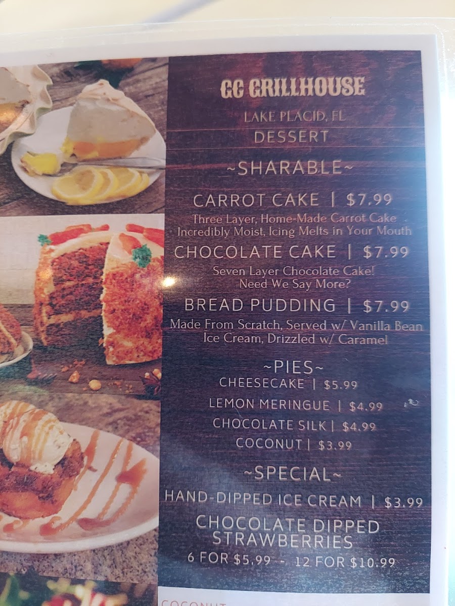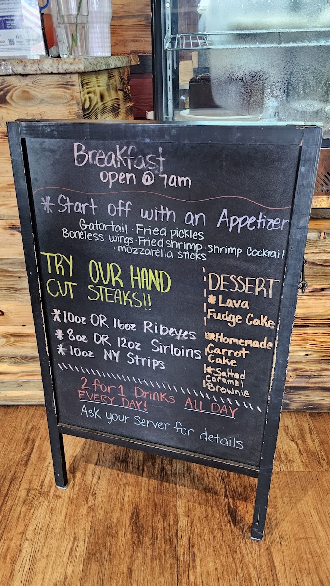 Throughout the day, you can enjoy comforting favorites like chopped steak, rib eye steak, and country fried steak, alongside lighter options such as Caesar salad and beef tips served over rice. Specialty items like fried alligator and fried shrimp reflect a regional touch that complements the familiar classics. Craft beverages such as strawberry lemonade and party punch add a refreshing finish to any meal.